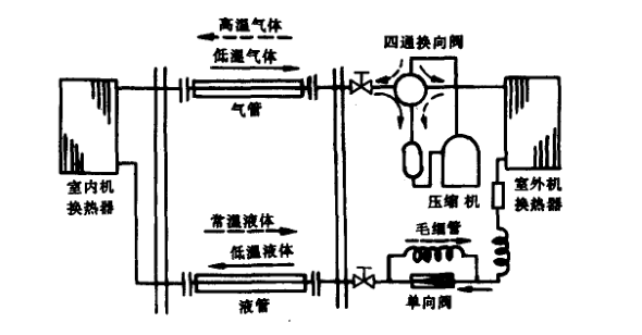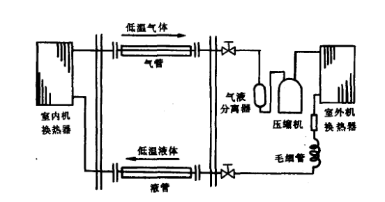 熱泵型空調(diào)器和熱泵輔助電熱型空調(diào)器,其制冷運(yùn)行時(shí)液管與氣管中制冷劑的狀態(tài)同單冷型,在制熱運(yùn)行時(shí),氣管中的制冷劑是壓縮機(jī)排出的高溫氣體,而液管中的制冷劑是在室內(nèi)機(jī)冷凝放熱后的常溫液體,若液管與氣管一起保溫,則氣管中的高溫制冷劑在進(jìn)入室內(nèi)機(jī)之前就向液管中的制冷劑放熱,進(jìn)入室內(nèi)機(jī)后放熱量減少,會(huì)造成制熱能力降低。所以,對于節(jié)流元件在室外機(jī)的分體式空調(diào)器,都應(yīng)將回氣管與供液管分開,單獨(dú)做好保溫處理較好,圖3-28為毛細(xì)管都在室外機(jī)的熱泵型空調(diào)器,較為常見。