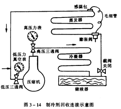 當一些小型制冷設備發生故障時,可將制冷劑從制冷系統中提取出來,排入備用的制冷劑容器中,這樣不僅可以避免制冷劑對大氣的污染,保護環境,而且能夠回收利用,減少浪費。開啟式制冷系統中的制冷劑可排入機組的儲液器內參閱圖3-14,具體操作方法如下: