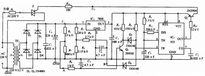 由7809三端集成穩(wěn)壓器提供9V直流穩(wěn)壓電源,經(jīng)分壓電阻分壓送入電壓比較器第?腳和第⑧腳作為高低基準(zhǔn)電壓,而6.3V交流電壓則經(jīng)二極管V1整流、C3濾波后作為采樣比較電壓輸人電壓比較器第⑨、⑩兩腳。