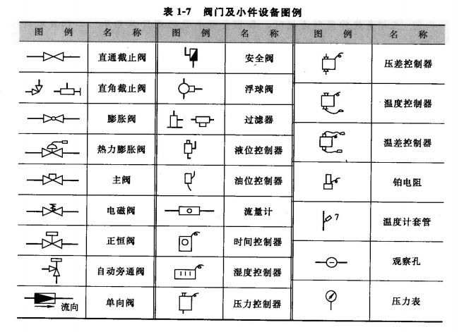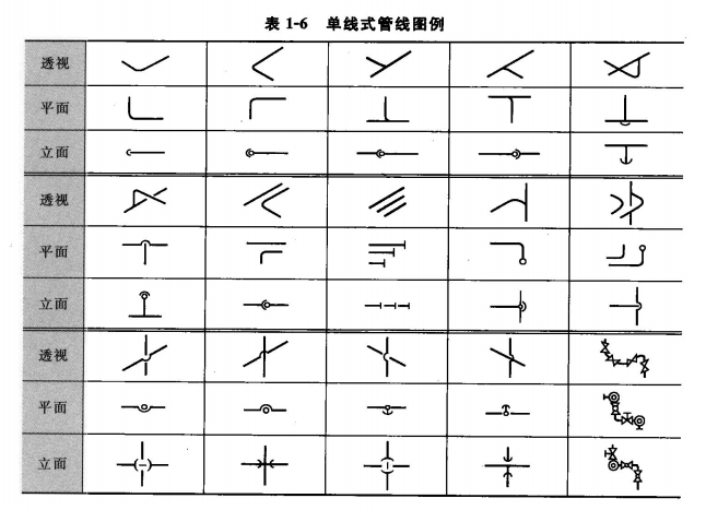 制冷管道的種類較多,如吸氣管、排氣管和液體管等,常用管線圖例見(jiàn)表1-5。管道的不同形狀在圖中的表示,見(jiàn)表1-6,表中分別用透視、平面和立面對(duì)照表示,立面是從透視圖的右下方觀測(cè)。制冷管道上帶有許多閥件,這些小件設(shè)備圖例見(jiàn)表1-7。