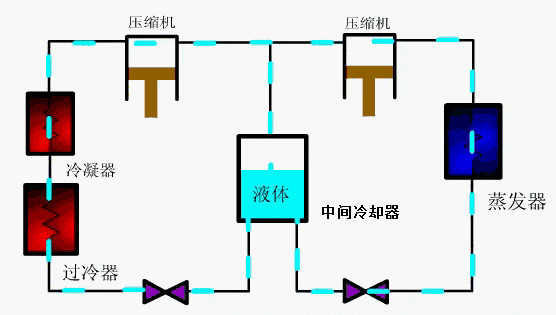 雙級壓縮制冷循環,由于它們的節流級數以及中間冷卻方式不同造成雙級壓縮制冷循環的形式不同。節流級數分為一級節流和二級節流。中間冷卻方式分為中間完全冷卻、中間不完全冷卻和中間不冷卻三種。一級節流是指由冷凝壓力到蒸發壓力由一個節流閥來完成;二級節流是指由一個節流閥把冷凝壓力節流到中間壓力,再由另一個節流閥由中間壓力節流到蒸發壓力。