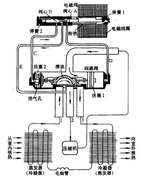 四通閥主要由控制閥與換向閥兩部分組成,如圖3-25所示。通過控制網(wǎng)上的電磁線圈和彈簧的作用力,打開和關(guān)閉其上的毛細(xì)管通道,使換向涂進(jìn)行換向。在制冷時電磁線圈不得電,控制閣內(nèi)的閱心將右方向的毛細(xì)管與中間的公共毛細(xì)管的通道關(guān)閉,使左方向毛細(xì)管與中間的公共毛細(xì)管的通道溝通,中間公共和毛細(xì)管與換向冰低壓吸氣管相連,所以換向閥左端為低壓腔。在壓縮機(jī)排氣壓力的作用下,活塞向左移動,直至活塞上的項(xiàng)針將換向閥的針座堵死。在托架移動過程中,滑塊將室內(nèi)換熱器(為蒸發(fā)器)與換向閥中間低壓管溝通,高壓排氣管與室外側(cè)換熱器(為冷凝器)相溝通,此時的空調(diào)器作制冷循環(huán),使室內(nèi)溫度下降。