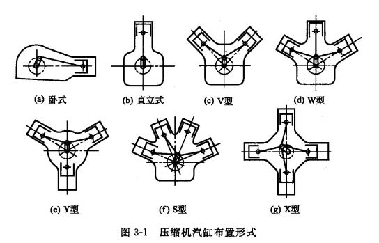 圖3-1所示為壓縮機(jī)汽缸布置形式。臥式壓縮機(jī)的汽缸軸線呈水平布置,其管道布置和內(nèi)部結(jié)構(gòu)的拆裝維修比較方便,多屬大型低速壓縮機(jī)。直立式壓縮機(jī)的汽缸軸線與水平面垂直,用符號Z表示。這類壓縮機(jī)占地面積小,活塞重力不作用在汽缸壁面上,因而汽缸和活塞的磨損較小。機(jī)體主要承受垂直的拉壓載荷,受力情況較好,因而形狀可以簡單些,基礎(chǔ)尺寸也可以小些。但大型直立式壓縮機(jī)的高度大,必須設(shè)置操作平臺,安裝、拆卸和維護(hù)管理均不方便,因而極少采用此種布置方式.即使是中小型壓縮機(jī),除單、雙缸外,也很少采用直立式的。角度式壓縮機(jī)的汽缸軸線,在垂直于曲軸軸線的平面內(nèi)具有一定的夾角。其排列形式有V型、w型、Y型、S型(扇型)、X型等。角度式壓縮機(jī)具有結(jié)構(gòu)緊湊、質(zhì)量輕、動力平衡性好、便于拆裝和維修等優(yōu)點(diǎn),因而在現(xiàn)代中、小型高速多位壓縮機(jī)中得到廣泛應(yīng)用。