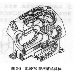 圖3-8為采用汽缸套的810F70型壓縮機的機體圖.機體上部為汽缸體,下部為曲軸箱.汽缸體上有8個安裝汽缸套的座孔,分成兩列,呈扇形配置。吸氣腔設在汽缸套座孔的外側,流過的制冷劑可對汽缸壁進行冷卻。吸氣腔與曲軸箱之間由隔板隔開,以防潤滑油濺入吸氣腔。隔板最低處鉆有均壓回油孔,以便由制冷劑從系統中帶來的潤滑油流回曲軸箱,并使曲軸箱內的氣體壓力與吸氣腔壓力保持一致。排氣腔在汽缸體上部,吸、排氣腔之間由隔板隔開。曲軸箱主要用于安裝曲軸,儲存潤滑油,安放油冷卻器、油過濾器和潤滑油三通閥.曲軸箱的前、后端有安裝主軸承的座孔,兩側有檢修用的窗孔。曲軸箱內壁設有多個加強肋,用以提高強度和剛度,這種機體外形平整,結構緊湊。汽缸冷卻主要靠水冷卻,冷卻效果較好。國內外高速多缸的活塞式制冷壓縮機的機體多采用這種形式。