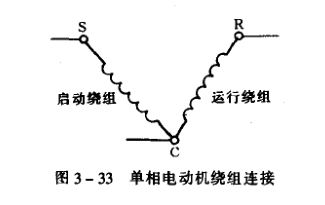 空調(diào)器用全封閉壓縮機的電動機有單相的和三相的。單相電動機有兩個繞組,即啟動繞組和運轉(zhuǎn)繞組。在全封閉壓縮負的外殼接線例內(nèi)有三個接線柱,如圖3-33所示。接線柱分別用R、S、C標志,它們代表運轉(zhuǎn)端、啟動端和公用端。其中R、S兩端之間是兩個繞組的串聯(lián)接點,電阻值是啟動繞組和運轉(zhuǎn)繞組的電阻之和;C、S兩端之間是啟動繞組接點;C、R兩端之間是運轉(zhuǎn)繞組接點。