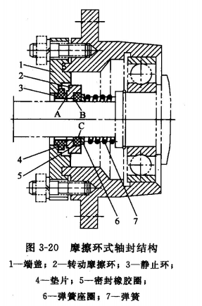 摩擦環式軸封又稱端面摩擦式軸封。圖3-20是一種較為常用的摩擦環式軸封,其結構簡單,維修方便,使用壽命長。它有三個密封面。①A為徑向動摩擦密封面,它由轉動摩擦環2和靜止環3的兩相互壓緊磨合面組成,壓緊力由彈簧7和曲軸箱內氣體壓力所產生。②B為徑向靜密封面,它是由轉動摩擦環與密封橡膠圈5之間的徑向接觸面所組成,靠彈簧壓緊,并與軸一起轉動。③C為軸向密封面,它是由密封橡膠圈的內表面與曲軸的外表面所組成,因密封橡膠圈的自身彈性力使其與曲軸間有著一適當的徑向密封彈力。當曲軸有軸向竄動時,密封橡膠圈與軸間可以有相對滑動。