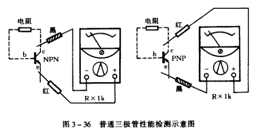 測量參數主要是Iceo和hFE。按圖3-36所示,可估測三極管的Iceo。通常鍺小功率及中功率管的實測阻值應在10~20kΩ以上;硅三極管應大于100kΩ,實測值實際多為m,即看不出表針擺動。若實測阻值過小,表明Iceo很大,這種管子性能及穩定性都較差,一般不宜使用。如果實測值近于零,說明管子的c、e極間已擊穿。用此法也可檢測ICBO,只要將表筆改接b、c極,測量b、c結反向電阻即可。通常鍺管的測量阻值應比測Iceo。時的阻值大,硅管則為∞。