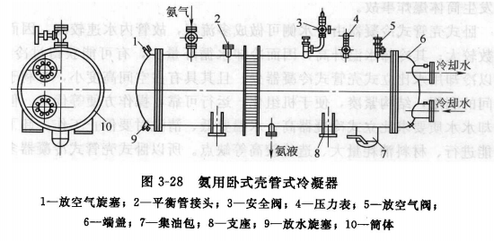臥式殼管式冷凝器較普遍地應(yīng)用于大、中、小型的氨、氟里昂制冷系統(tǒng)中。圖3-28、圖3-29分別為氨和氟里昂用臥式殼管式冷凝器。它的結(jié)構(gòu)與立式殼管式冷凝器類似,也是由筒體、管板、換熱管等組成。由于是水平安置,故在筒體兩端設(shè)有帶分水槽的鑄鐵端蓋,端蓋與筒體端面間夾有橡膠密封圈,用螺栓連接固定。在一端的端蓋上有冷卻水的進出水管接頭,在另一端的端蓋頂部裝有放空氣的旋塞,用于供水時排出存積在其中的空氣。下部有放水旋塞,當(dāng)冷凝器在冬季停止使用時,可放出其中的積水,以防凍裂冷卻水管。在橫臥的冷凝器筒體上部依次安裝有進氣管、平衡管、安全閥管、壓力表管、放空氣管等管接頭,筒體下部安裝有出液管接頭。平衡管用于和冷凝液儲液器連接,起均壓作用。若直接利用筒體下部儲液,不另設(shè)儲液器時,則不設(shè)平衡管。對于與離心式制冷機配套用的大型冷凝器,因管排數(shù)較多,為減少管外冷凝液膜的厚度對傳熱的影響,在管束中間裝有導(dǎo)流板。另外,由于換熱管較長,為減少管簇振動,在管子中常裝有支承板。