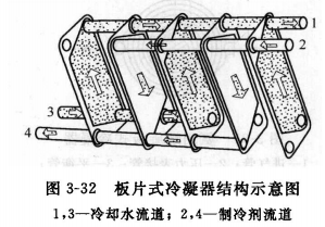 板片式冷凝器的結構緊湊、重盆輕、體積小、傳熱效率高,而且換熱面積可通過改變板片數目任意調節。它的缺點是內容積很小,不能儲存液體,制冷系統中必須另設儲液器,而且由于板片之間的間隙很小,冷卻水側容易被雜質堵塞,所以一般應在冷卻水側加裝過濾器。