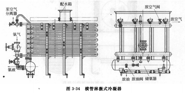淋激式冷凝器是用冷卻水淋灑在大氣中的水平管排上,使管內制冷劑凝結的冷凝器。淋激式冷凝器又稱為淋水式冷凝器。根據換熱管排列不同分為兩種,一種是用無縫俐管制成蛇形管組,稱為橫管淋激式冷凝器(一般簡稱為淋激式冷凝器);另一種用無縫鋼管彎制成螺旋形管組裝而成,稱為螺旋管琳激式冷凝器。圖3-34為橫管淋激式冷凝器示意圖。冷卻水從上部配水箱流入水槽中,經水槽鋸齒形滋水口均勻地流下,淋澆在冷卻管組外表面,最后流入水池。青島制冷劑蒸氣由下部進入冷卻管組,管內凝結的制冷劑液體從冷卻管一端彎頭處支管流出,后經主管流入儲液器。淋激式冷凝器一般用于氨制冷裝置。