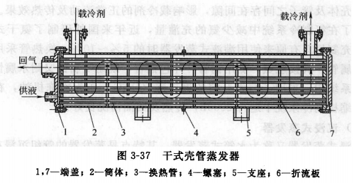 干式殼管式蒸發器不僅克服了滿液式殼管式蒸發器的一些缺點,而且由于臨沂制冷劑在管內汽化,管外被水或鹽水包圍,冷量損失較小。管外空間的充水量較大,有一定的熱穩定性,而且不會發生管子結凍而脹裂的現象。但是干式殼管式蒸發器的裝配工藝較復雜,管外(水垢)清洗比較困難,而且折流板與殼體及管予之間存在間除,影響載冷劑的正常流動及傳熱效果。