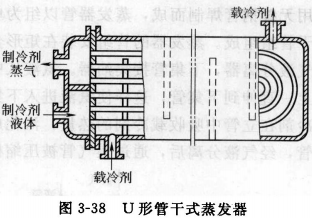 干式殼管蒸發器的外形和結構,與滿液式殼管蒸發器基本相同。主要不同點在于:干式殼管蒸發器中制冷劑在換熱管內汽化吸熱,制冷劑液體的充注量很少,大約為管組內容積的35%~40%,而且制冷劑在汽化過程中,不存在自由液面,所以稱為“干式蒸發器”。圖3-37所示為一種氟里昂干式蒸發器的構造。在干式蒸發器中,液體載冷劑在管外流動,為了提高載冷劑的流速,在筒體內橫跨管束裝有多塊折流板。圖3-38所示為氟里昂U形管干式蒸發器,換熱管安裝在同一塊管板上。換熱管可先行安裝后再裝入殼體,制冷劑可始終在一根管子內流動和汽化,不會出現多流程時氣液分層現象。但由于每根換熱管的彎曲半徑不同,制造時需采用不同的加工模具。