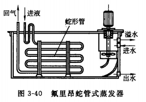蛇管式蒸發器是小型氟里昂裝置中常用的一種蒸發器。其結構如圖3-40所示。