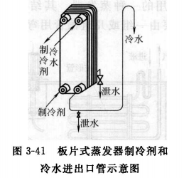 板片式蒸發(fā)器必須豎直安裝,并使制冷劑下進(jìn)上出,以保證制冷劑均勻分配。板片式蒸發(fā)器的冷水管可以是下進(jìn)上出,也可以安排上進(jìn)下出,但上進(jìn)下出時(shí)必須有泄水旋塞。泄水旋塞可以裝在蒸發(fā)器的后面,也可以直接裝在管路上。為了確保板片式蒸發(fā)器總是充滿水,在冷水出口處應(yīng)有一個(gè)向上的U形彎。板片式蒸發(fā)器的臨沂制冷劑和冷水進(jìn)出口管如圖3-41所示。