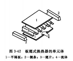 近年來開始使用的板翅式換熱器就是在板片式換熱器的基礎(chǔ)上發(fā)展起來的。板翅式換熱器是在不銹鋼平板之間緊密地夾嵌波紋狀金屬導(dǎo)熱翅片,并在四周加上側(cè)封條組成單元體,對各個(gè)單元體進(jìn)行不同的登積和適當(dāng)?shù)呐帕校龠M(jìn)行整體釬焊。上、下兩塊平金屬板稱為平隔板。單元體如圖3-42所示。