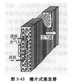 翅片式蒸發器結構如圖3-43所示,它一般用于氟里昂空調制冷系統。液體制冷劑不斷從蒸發器周圍吸收熱量,在管內汽化,使周圍空氣不斷降溫,從而達到空調制冷目的。