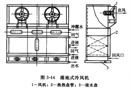 圖3-44為落地式冷風機結構示意圖。以氨為制冷劑的冷風機,換熱管組大都制成上下兩組,管組由無縫鋼管外繞翅片制成,下部管組翅片間距稍大,避免回風濕度大時翅片間被箱阻塞。上部管組翅片間距稍小,以便增加傳熱面積。制冷劑液體從管組下部進入,汽化后制冷劑氣體從管組上部被壓縮機吸入。管組之上還裝有沖霜淋水管,當用熱氨沖霜時,同時在管組外噴淋水,使管外積結的霜層很快被沖除。冷風機的最上層是風機室,內裝風機,根據風量和風壓選取合適的風機和臺數。風機室有一定的高度,使通過翅片管的風速趨于均勻。冷風機的最下部裝有盛水盤,承接換熱管組上的凝結水和沖霜水。