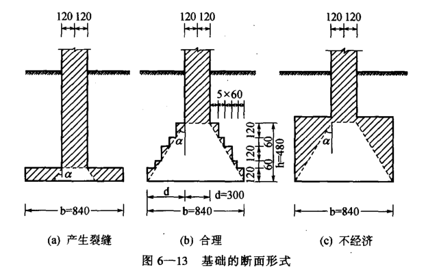 斷面形式:我們在實際工程中會看到磚砌條形基礎的斷面是臺階形的。如圖6-13(b)所示。