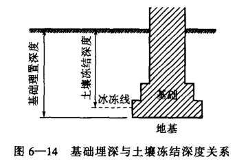 3、土的凍脹:寒冷地區基礎的埋置深度還要考慮土層凍脹的影響。因為土中含有水分,當土的溫度降到0℃時就開始凍結。土的凍結從地面開始,隨著氣溫下降,凍結深度逐漸增加。若土層接近地下水,由于土的毛細管作用可以把地下水吸到已凍結的土層上并逐漸增大冰的體積,相應也增大了土層的凍脹。基礎底面若放在凍結的土層范圍內,冬季土層凍脹可以把房屋拱起,春季土層解凍房屋又下沉,同時,由于房屋各段基礎下面土層凍脹、解凍并不一致,使房屋各段產生不均勻拱起或沉降;逐年凍融交替,基礎、墻身就可能出現裂名,以致影響房屋的安全使用。所以在多數情況下,應將基礎埋置在最大凍結深度以下。見圖6-14。我國各地區土的凍結深度差別很大,例如哈爾濱為地面下2米,北京為0.8~1.0米,濟南為0、.5米,南方一般不存在地基土凍脹影響基礎的問題。
