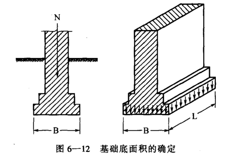 取一段L米長的中心受壓條形基礎(chǔ),基礎(chǔ)寬度為B米。這段基礎(chǔ)的底面積為工L×B米,見圖6-12。若通過這一面積傳下來的總荷載為N(荷載是指上部結(jié)構(gòu)傳下來的荷載及基礎(chǔ)自重,基礎(chǔ)上面回填土重量的總和,以噸為單位),地基承載力為R(t/m2),則N=R×L×B。這一等式表達了綜合在、地基承載力、基礎(chǔ)面積三者之間大關(guān)系。當(dāng)房屋的總荷載不變時,則基礎(chǔ)放在承載力較大的土層上,基礎(chǔ)的底面積可以小些;放在承載力較小的土層上,基礎(chǔ)的底面積就需要大些。它與基礎(chǔ)本身材料的強度沒有關(guān)系。