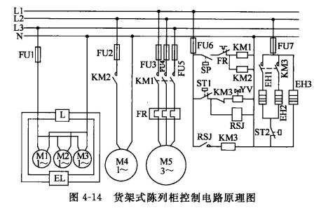 接通電源后,交流接觸器KM1, KM2常開主觸點閉合,風扇電動機M4和壓縮機電動機M5啟動,同時,電磁閥YV開啟,融霜定時器RSJ計時。當柜內達制冷溫度要求時,制冷溫度控制器ST1斷開,從而使YV, RSJ徽型電動機都失電,YV關閉,RSJ計時停止。YV失電后,M4, M5繼續工作,當壓縮機低壓側壓力降到設定值時,壓差控制器SP斷開,使KM1, KM2線圈失電,從而KM1, KM2常開觸點恢復斷開狀態,M4, M5失電停轉。當柜內溫度上升到開機設定值時,ST1接通YV, RSJ微型電動機得電,YV開啟,高壓降低,低壓回升,RSJ計時又開始。當高低壓力值減小到設定值時,SP又閉合,KM1, KM2線圈又得電,KM1, KM2常開觸點閉合。M4, M5又得電運轉,制冷循環開始重復上述過程,實現自動控制制冷過程。RSJ對壓縮機的運轉時間進行累計,累計時間達設定值(一般為12h或24h)時,RSJ的常開觸點閉合,交流接觸器KM3線圈得電,KM3常開觸點閉合,融霜電熱絲EH1, EH2開始加熱融籍,同時,KM3常閉觸點斷開,YV失電,因此,在融霜剛開始時,M4, M5繼續工作,當低壓側壓力降到設定值時,SP斷開,M4, MS停轉,融霜繼續進行。融霜由RSJ與融霜溫度控制器ST2共同控制,當融霜時間達設定時間值(30~40min)時,RSJ動作,使RSJ常開觸點恢復斷開狀態,KM3線圈失電,EH1,EH2斷電,停止加熱。如果融霜時間沒有達到設定值,而柜內溫度上升較高,ST2斷開,同樣可停止融霜,但KM3線圈仍有電,RSJ繼續積累融霜時間,當達到設定值時,KM3線圈才失電。KM3線圈失電后,YV得電,高低壓差降低,SP閉合,M4, M5啟動運轉,恢復制冷循環。在制冷與融霜整個過程中,柜內風機M1~M3一直運轉,從而促進換熱,又能形成空氣幕。圖中,EH3是防漏電熱絲,L是快速啟動鎮流器,EL是柜內熒光燈。