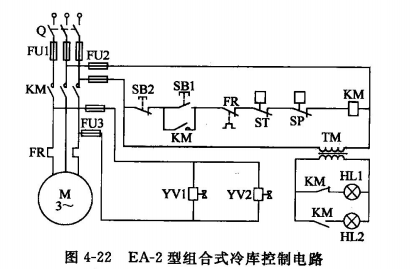 EA-2型組合式冷庫控制電路如圖4-22所示。主電路有刀開關Q,熔斷器FU1,交流接觸器的主觸點KM,熱繼電器的熱元件FR及馭動壓縮機的三相異步電機M,控制電路比較簡單,除啟動按鈕SB1I和停車按鈕SB2外,還有沮度控制器ST,壓力控制器SP,熱繼電器的常閉觸點FR和文流接觸器線圈KM。