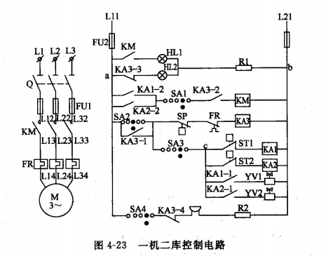 一機二庫控制電路原理如圖4-23所示。該系統由庫房1,庫房2組成。