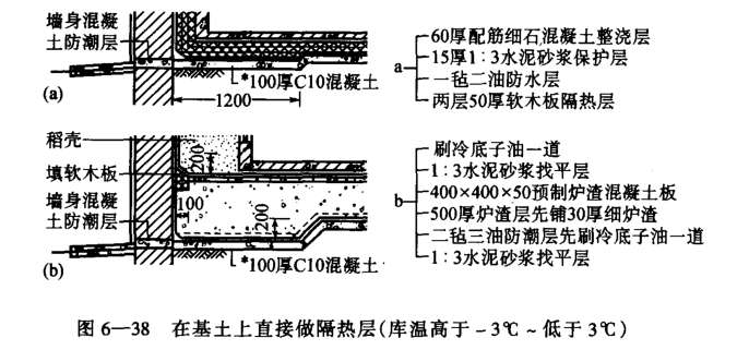 高溫庫系指庫溫在0℃及以上的庫房,這類庫房一般不出現地坪凍脹的問題,其地坪一般僅需要在靠外墻的局部做隔熱層,其余范圍內只做普通地坪,參看圖6-37及6-38。