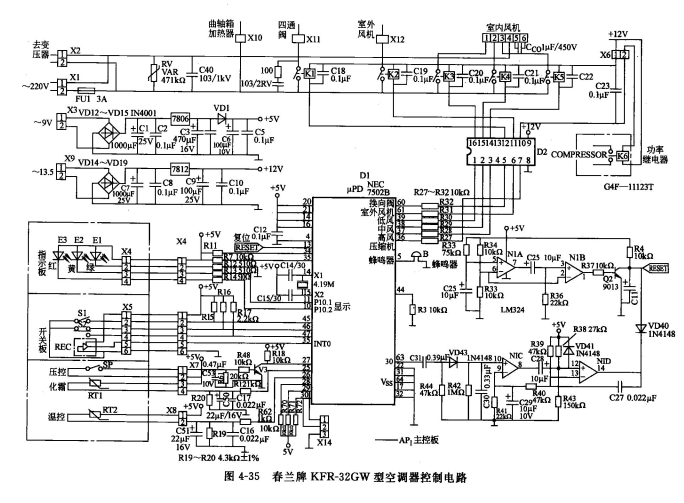 a.操作指令信號輸入電路包括遙控信號輸入和按鍵信號輸入。紅外線遙控接收器為HM377,通過REC, X5插件的5腳將信號送至單片機D1的35腳。S1為強制運行開關,當S1開關接通時,單片機D1的45腳為低電平,單片機經過分析判斷,立即啟動強制運行程序。S2為轉換開關,正常時,S2與單片機D1的46腳成常通狀態,而47腳則處于高電平,在此狀態下,空調器處于遙控運行狀態。當開關S2撥向與X5的4腳接通的位置時,則46腳處于高電平,47腳處于低電平,單片機經過分析判斷,立即啟動自動運行程序。