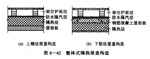 整體式隔熱屋蓋:根據隔熱層的鋪設位置,這種屋蓋構造可分為上鋪法與下貼法兩種,如圖6-42所示。