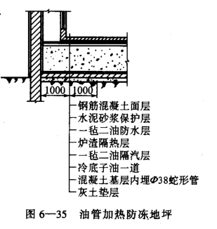 (7)在管道和鋼筋網上澆灌100毫米厚滿堂混凝土,要求混凝土把油管和鋼筋網上下包囊嚴密,混凝土須振的密實,并注意養護。油管加熱地坪見圖6-35。