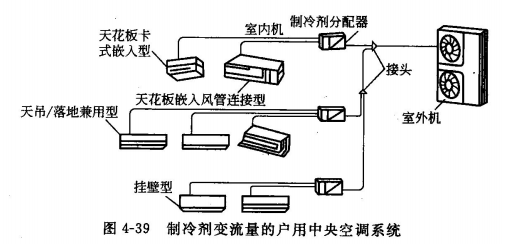制冷劑空調系統又稱多聯機式空調系統(簡稱VRV系統)。這種系統以制冷劑為載冷(熱)介質,采用制冷劑變流量技術(Variable RefrigerantVolume)。其系統原理如圖4-39所示。主機為制冷壓縮機、室外空氣側換熱器和其他制冷附件組成的室外機,末端裝置是由風機和室內空氣側換熱器組成的室內機。一臺或多臺室外機與若干個室內機聯成一個空調系統。采用