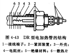 a電加熱管圖4-43是DR型電加熱管的結構簡圖。電加熱管是利用電流通過電阻絲,對空氣進行加熱的設備。一般根據所需加熱功率,由電阻絲、外殼、散熱片和接線端等元件組裝而成。