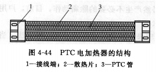 b. PTC電加熱器圖4-44為戶用中央空調輔助PTC電加熱器的結構簡圖。PTC電加熱器加熱元件的材料為杖酸鋇陶瓷,由于其本身為陶瓷體,所以具有耐腐蝕、使用壽命長(可達幾萬小時)和換熱效率高(可達98%)等特性。