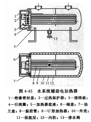C.水系統輔助電加熱器圖4-45所示的水系統輔助電加熱器就是其中一種。這種輔助電加熱器的結構特點是:采用不銹鋼材料,具有較強的防腐蝕能力;內膽與外殼之間填充保溫 材料,保溫性能好;加熱管采用了抗腐蝕性能好的不銹鋼材料,使用壽命長;內置折流板使加熱均勻,熱效率高,設置了水溫控制器和缺水保護器,提高了安全性。