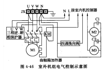 室外機(jī)組 圖4-46所示為麥克維爾公司室外機(jī)組的電氣控制回路示憊圖。三相電源U, V, W通過三相交流接觸器KM的電磁開關(guān),與壓縮機(jī)電動(dòng)機(jī)M1接線柱連接。考慮使用三相電源,操作人員會(huì)發(fā)生相序接反和斷相因素,影響壓縮機(jī)的正常使用,必須在三相電源上連接三相逆、斷相保護(hù)器,保證壓縮機(jī)在正常的電源條件下使用。通過室內(nèi)控制器的控制信號(hào),對(duì)三相文流接觸器KM線圈的電流進(jìn)行控制。再由交流接觸器的主觸點(diǎn)控制壓縮機(jī)電源,使壓縮機(jī)運(yùn)轉(zhuǎn)或停轉(zhuǎn)。考慮有些大功率壓縮機(jī)曲軸箱對(duì)溫度的要求,利用文流接觸器KM的常閉觸點(diǎn).使壓縮機(jī)電源被切斷后,曲軸箱加熱器立即接通電源對(duì)壓縮機(jī)曲軸箱進(jìn)行加熱。當(dāng)壓縮機(jī)禽要運(yùn)行時(shí),壓縮機(jī)電源被交流接觸器KM的主觸點(diǎn)接通,壓縮機(jī)立即運(yùn)行。壓縮機(jī)運(yùn)行后無需對(duì)曲軸箱進(jìn)行加熱,因此壓縮機(jī)運(yùn)行時(shí),曲軸箱加熱器電源同時(shí)被立即切斷。