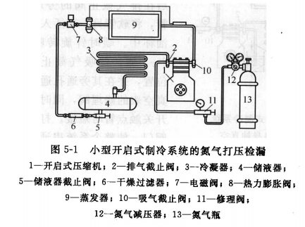 給制冷系統充入高壓氮氣檢漏是一種比較可靠的檢漏方法,它不會使制冷系統產生冰堵故障。氮氣打壓檢漏操作如圖5-1所示。充入高壓氮氣前,首先將制冷系統的各閥門都打開,若制冷系統有電磁閥,則還要將電動機與壓縮機的傳動皮帶拆下(或為使電磁閥開啟,也可將電磁閥接線從原電路上拆下,另接控制電源單獨供電),再用耐壓軟管將高壓氮氣瓶與壓縮機排氣截止閥的旁通孔通道相連接,并使排氣截止閥呈三通狀態,向制冷系統充入1. 0MPa的氮氣,此時給機組通電,使電磁閥開啟(電動機空轉),然后用洗潔精或肥皂水涂抹各個接頭、接口等易泄漏處,出現氣泡處即為泄漏點。若電磁閥是接在冷卻水路上(即水冷式機組),則電磁閥與制冷系統無關,可直接從壓縮機排氣截止閥旁通孔通道充入高壓氮氣進行檢漏。