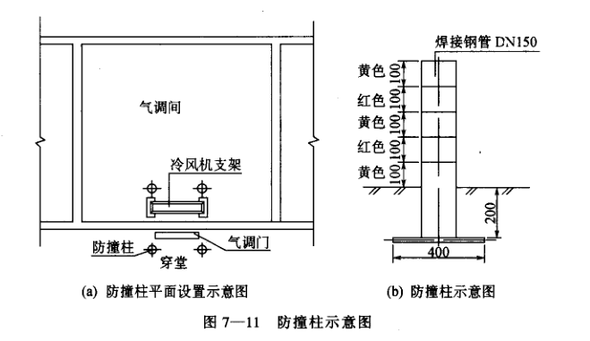 為了保證氣調庫的氣密性,防止鏟車在進出庫時碰撞門扇、門框以及門口處的冷風機鋼支架,應在門洞內外設置防撞柱,如圖7-11。