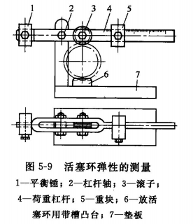 活塞環的彈性可用彈性儀進行測量,見圖5-9?;钊h的彈性是根據它從自由狀態的鎖口間隙壓縮到工作狀態的間隙所需要的應力來決定的。一般氣環直徑40~100mm為0.14~0.11MPa, 100~300mm為0. 11~0. 05MPa,如果壓縮應力降為原有應力的25%。應更換新環,油環彈力約比氣環小一半。