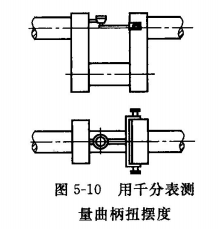 b.曲軸兩端以及軸與主軸承的同心度測量可通過測量曲軸四個位里的扭擺度而得知。其方法是將裝有千分表的測量曲柄支架固定在曲拐上,表頭接觸點裝置在主軸的曲柄外緣,撥動軸一周,在每隔90°角處,從千分表讀數來檢查曲軸的扭擺度,如圖5-10所示。其各點間的允許差值為0.02~0.04mm。如扭擺度過大,將導致曲柄與曲柄銷相連接處的金屬過度疲勞,造成裂紋和折斷事故。