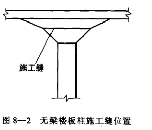 8、澆灌支撐無梁樓板的柱子時,必須把施工縫留在柱腳和柱帳45°折線項部(即柱帽折線轉(zhuǎn)折處)。柱帽上部混凝土應(yīng)和樓板一次澆灌,柱帽下部混凝土應(yīng)和柱子一起澆灌。見圖8-2。