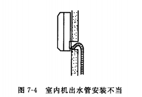 安裝不當。如圖7-4所示,從外觀上看,出水口比室內機接水槽低,室內機排水應不成問題,但實際上,由于排水管內氣壓的作用,接水槽內的水無法排出,必然會滋出流向室內,從而使室內機出風口處的水流綿綿不斷。處理這種故障的方法是將室內機水管道往室外的通道重新處理,其正確的走向如圖7-5所示。