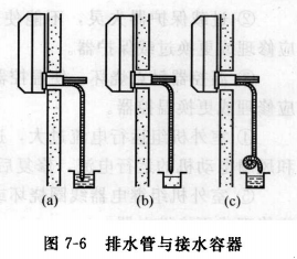 使用不當。用戶處理空調機流水的方法不當,也易造成漏水現象。如有些空調機向外直接排水不便時,用戶常在室內或室外排水管下方放一接水容器。一般來說,夏季里一間15m2的房間,空調機24h可排水10~15L。因此,接水容器內的水常將排水管口淹沒(特別是在排水管較長或容器較深時),如圖7-6 (a)所示,此時由于大氣壓的作用,排水管不易排出的水逐漸滋至室內機接水槽口出現漏水現象。解決的方法是將排水管懸空在接水容器上方即可,如圖7-6 (b)所示,但不要將排水管彎曲過度,如圖7-6 (c)所示。