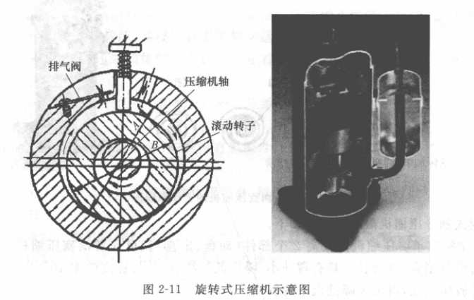 旋轉式壓縮機的電機無須將轉子的旋轉運動轉換為活塞的往復運動,而是直接帶動旋轉活塞做旋轉運動來完成對制冷劑蒸氣的壓縮。旋轉式壓縮機的結構如圖2-11所示。隨著曲軸的旋轉,制冷劑氣體從吸氣口被連續送往排氣口。滑片靠彈簧與轉子保持經常接觸,把吸氣便與排氣側分開,使被壓縮的氣體不能返回吸氣側。在氣缸內的氣體與排氣達到相同的壓力之前,排氣閥保持閉合狀態,以防止排氣倒流。