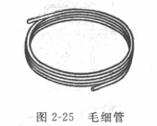 毛細管是制冷循環系統中的節流降壓部件。在電冰箱、家用空調器等小型制冷設備中,常用毛細管作為節流裝置,它主要是靠管徑和長度的大小來控制液體制冷劑的流量,以使蒸發器能在適當的狀況下工作,如圖2-25所示。這種節流作用,一方面使得冷凝器內保持一個的高壓,以保證氣態制冷劑在定溫下冷凝液化,另一方面使得蒸發器內維持一定的低壓,有助于液態的R22制冷劑在蒸發內吸熱沸騰,進行氣化。目前使用的毛細管為內徑0.6~2.5mm的銅管,管長則根據制冷系統的需要而定,一般長度在0.5~2.0m。