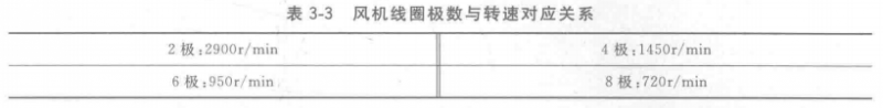 ⑤風機轉速快慢跟電容容量無關系,決定風機轉速的是線圈極數,如通過增加電容容量來增加風機轉速的想法是不可取的,并且容易因過熱損壞風機線圈。極數與每分鐘轉速(r/min) X寸應關系見表3-3。