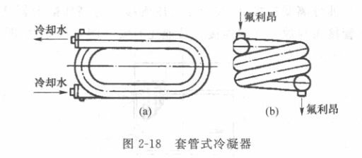 套管式冷凝器可以套放在壓縮機的周圍,節(jié)省了壓縮冷凝機組的占地面積。其缺點是單位換熱面積的金屬消耗量大,而且當縱向管數(shù)較多時,下部的管子充有較多的液體,使傳熱面積不能充分利用,另外冷卻水流動阻力大,清洗困難,并需要大量連接彎頭,因此,這種冷凝器在氨制冷裝置中已經(jīng)很少應用了。