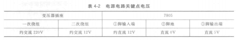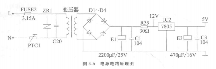 電源電路原理圖見圖4-5,關鍵點電壓見表4-2。電路的作用是將交流220V電壓降壓、整流、濾波、穩壓后轉換為直流12V和5V為主板供電。