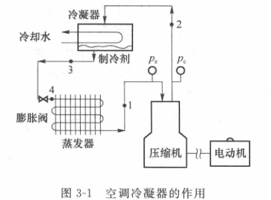 冷凝器的作用是冷卻從壓縮機(jī)出來的高溫制冷劑。冷卻它的方式通常有兩種,一種是風(fēng)冷式,一種是水冷式。所謂的水冷式冷凝器,如圖3-1所示,就是用一個殼管式的換熱器,制冷劑走在殼層(銅管外側(cè)),銅管內(nèi)部走水,利用冷卻水來帶走制冷劑的熱量。冷卻水帶著殼管式冷凝器的熱量,這些熱量通過冷卻塔散熱后降溫,重新回到系統(tǒng)中繼續(xù)冷卻。