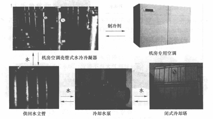 這種方式一般應(yīng)用在風(fēng)冷空調(diào)無法布置的場合,每層機(jī)房恒溫恒濕空調(diào)機(jī)組的冷凝器(相當(dāng)于室外機(jī))集中放置,與室內(nèi)機(jī)采用銅管連接,減少了樓層冷卻水管施工量,避免在機(jī)房內(nèi)布設(shè)水管。典型機(jī)房精密空調(diào)水冷系統(tǒng)如圖3-2所示。